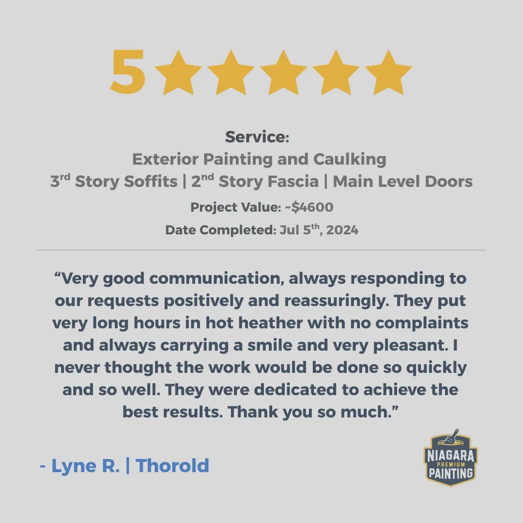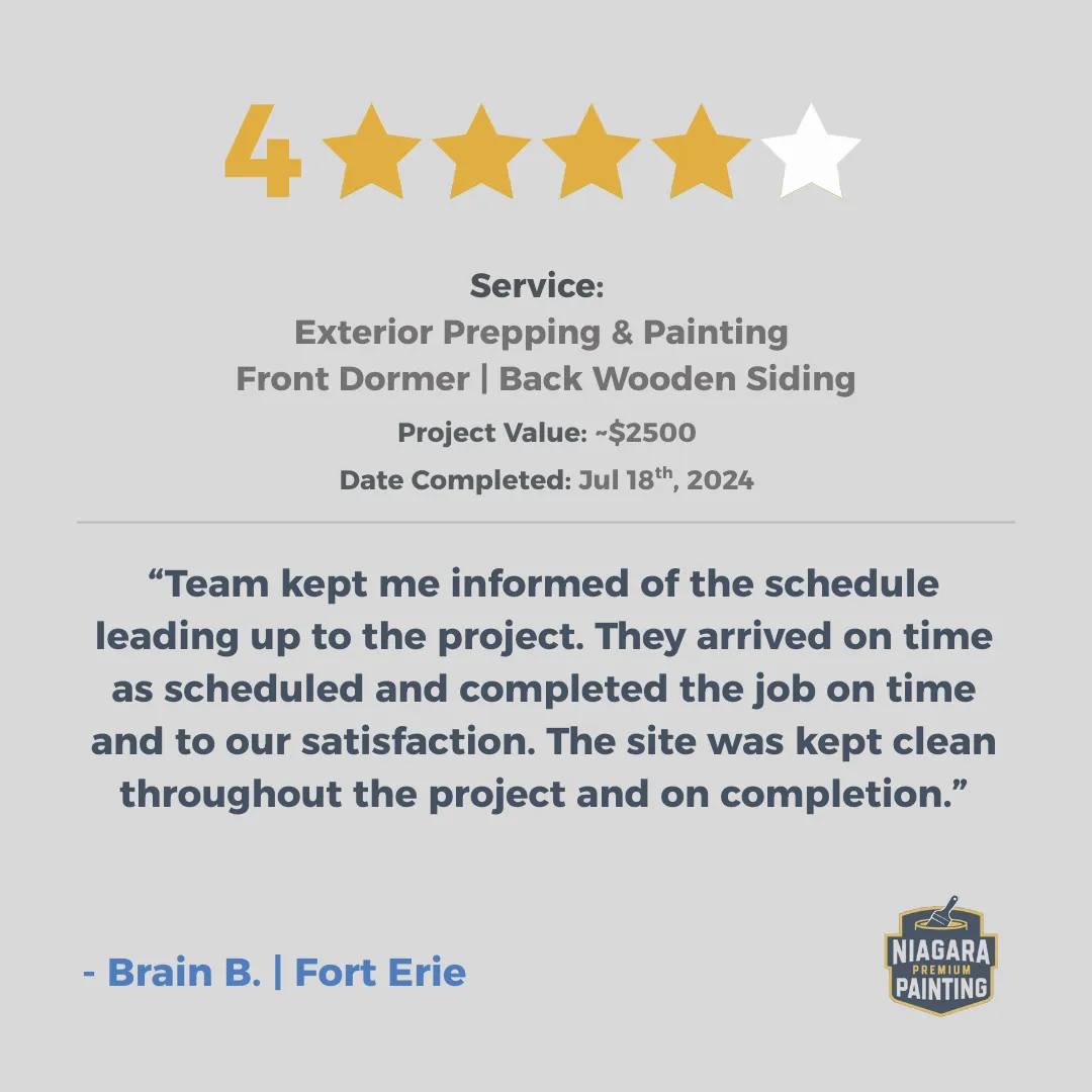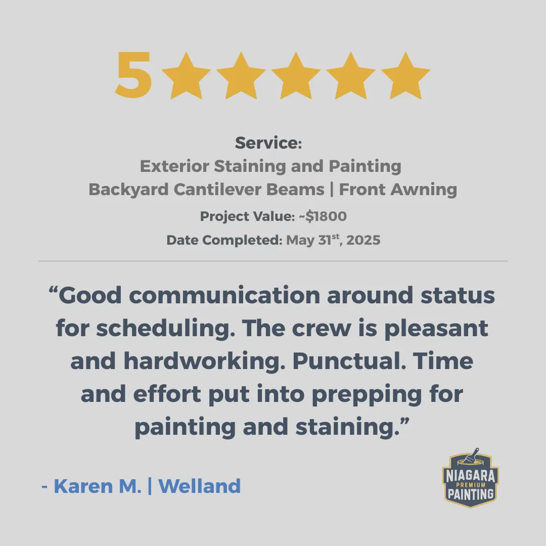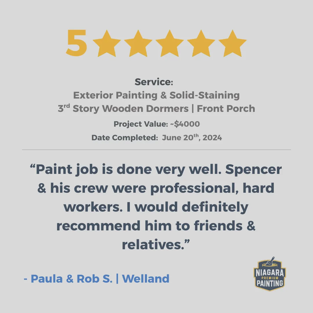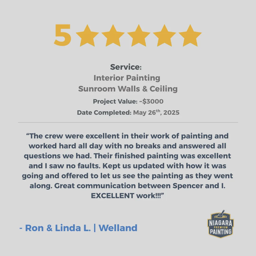 We exclusively use high-quality premium lines from trusted brands like Sherwin-Williams, Benjamin Moore, and Dulux. These products are specifically chosen for their ability to withstand Niagara’s unique climate, from our humid, lakeside summers to our freezing, damp winters.